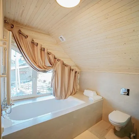 Offering an adjoining terrace and a balcony, the Yablunytsya property welcomes guests with ironing facilities and an air conditioner, as well as a television with satellite channels. Along with a sofa, the interior features a stone fireplace and sound-proofed windows. Bathroom facilities also include a roll-in shower, a bathtub, and a separate toilet. A hair dryer, bathrobes, and a shower cap are included to enhance your comfort.